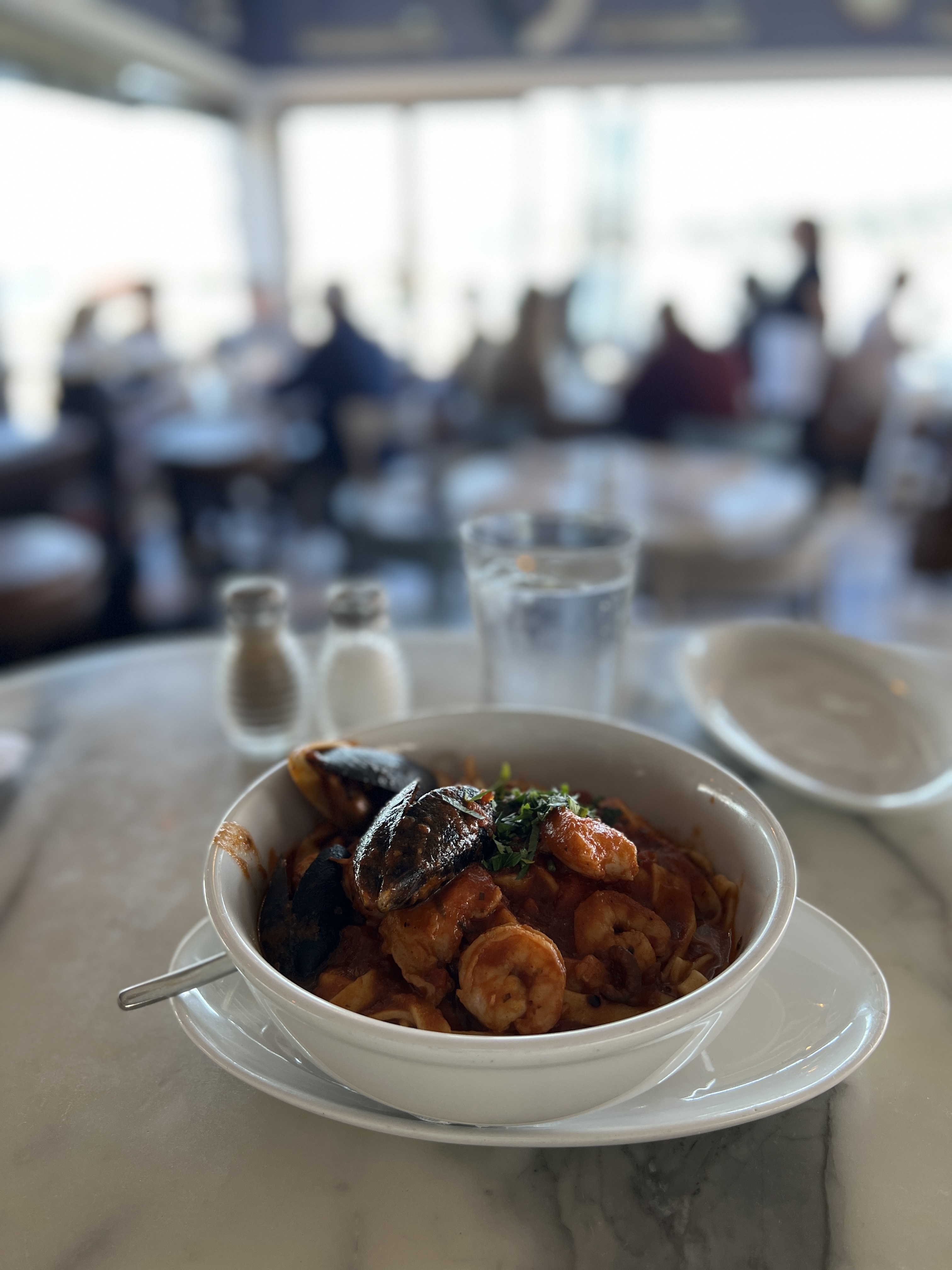 창밖으로 탁 트여있는 바다랑 언덕, 언덕에 아기자기 모여있는 비싸 보이는 주택들..! 그리고 해산물이 가득 들어있는 토마토 파스타까지 다 너무 완벽했다.