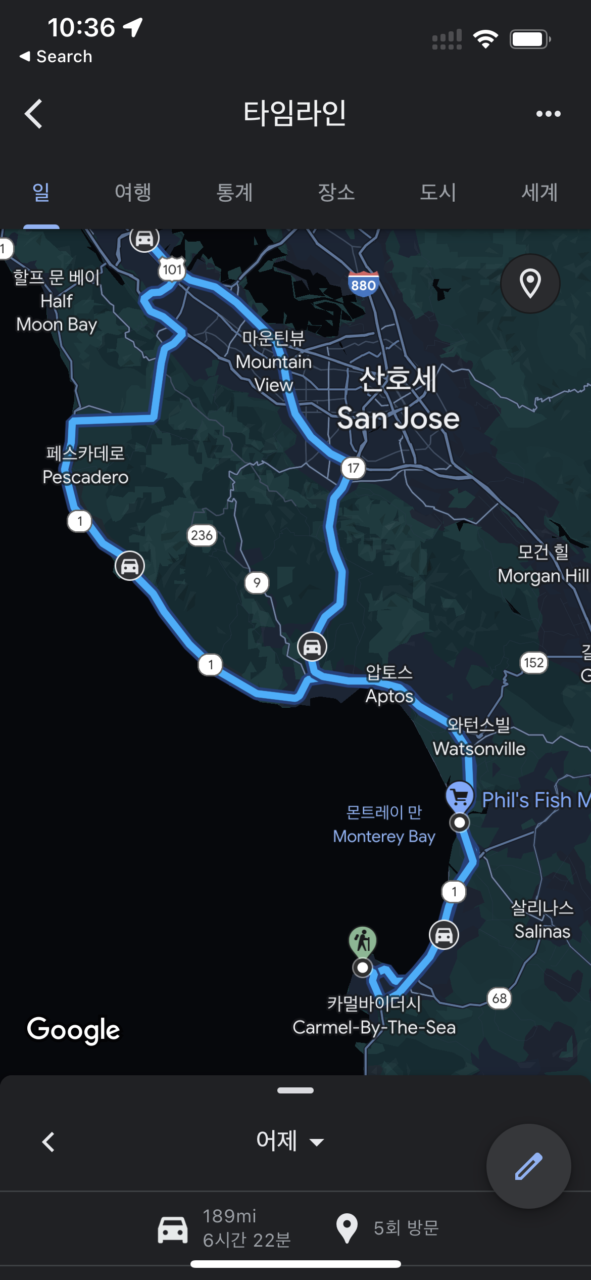1번 국도를 타고 해변을 낀 채 남쪽으로 쭉 내려가 Monterey 를 찍고 돌아오는 일정.